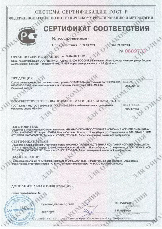 Краска огнезащитная для стальных конструкций «ОПЗ-МЕТ-О» на органической основе предназначена для огнезащиты стальных конструкций от воздействия огня. Краска представляет собой суспензию наполнителей и специальных добавок в органическом растворителе. Краска образует покрытие белого цвета с матовой поверхностью, содержащее (65÷70) % сухого остатка. По специальному заказу возможна колеровка краски ограниченным набором цветов и только на предприятии-изготовителе, для исключения возможного снижения огнезащитной эффективности краски. Краска и ее компоненты являются горючими и токсичным веществами при перевозке, хранении и нанесении. Высушенное покрытие на основе краски не оказывает вредного воздействия на организм человека. Огнезащитный состав для металлоконструкций на основе органического разбавителя